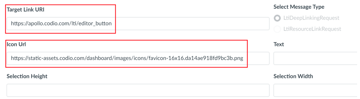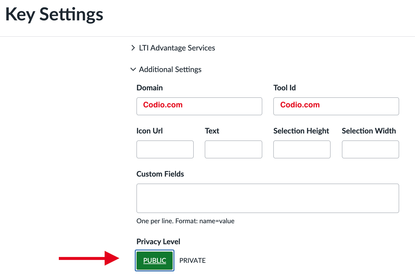 Type “codio.com” in both the Domain and Tool Id fields.