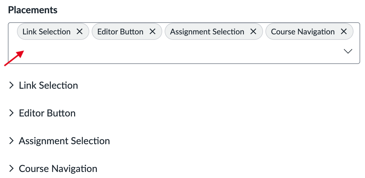 Scroll down to the Placements field. You can add a placement by starting to type the name and then selecting it when it appears. Placements that should be included (remove any others): Link Selection, Editor Button, Assignment Selection and Course Navigation.