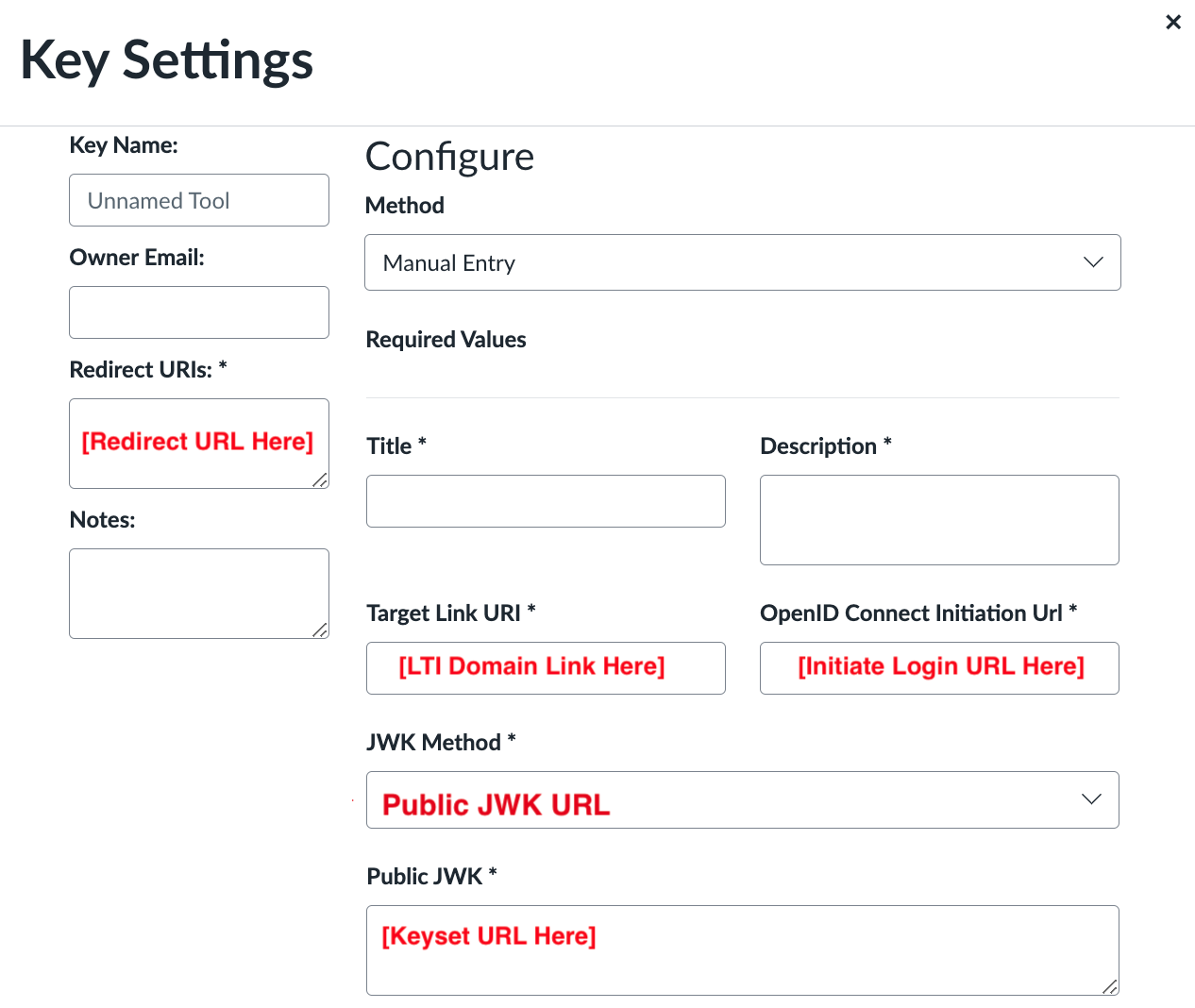 Replace [CANVAS DOMAIN] with your institution’s domain in steps 5–7. Remove the brackets. Example: https://yourinstitution.instructure.com/api/lti/security/jwks