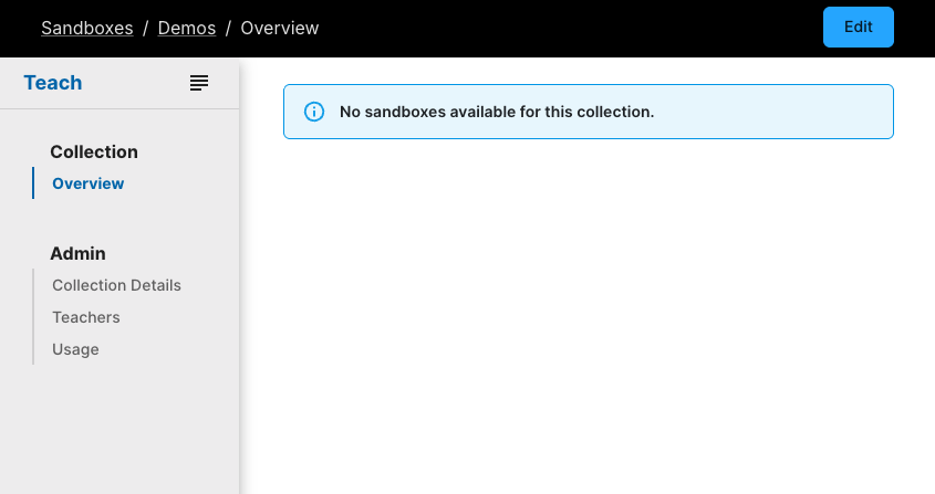 Once created, your new collection will open automatically. Click Edit to start creating sandboxes. The section below explains how to get started quickly.