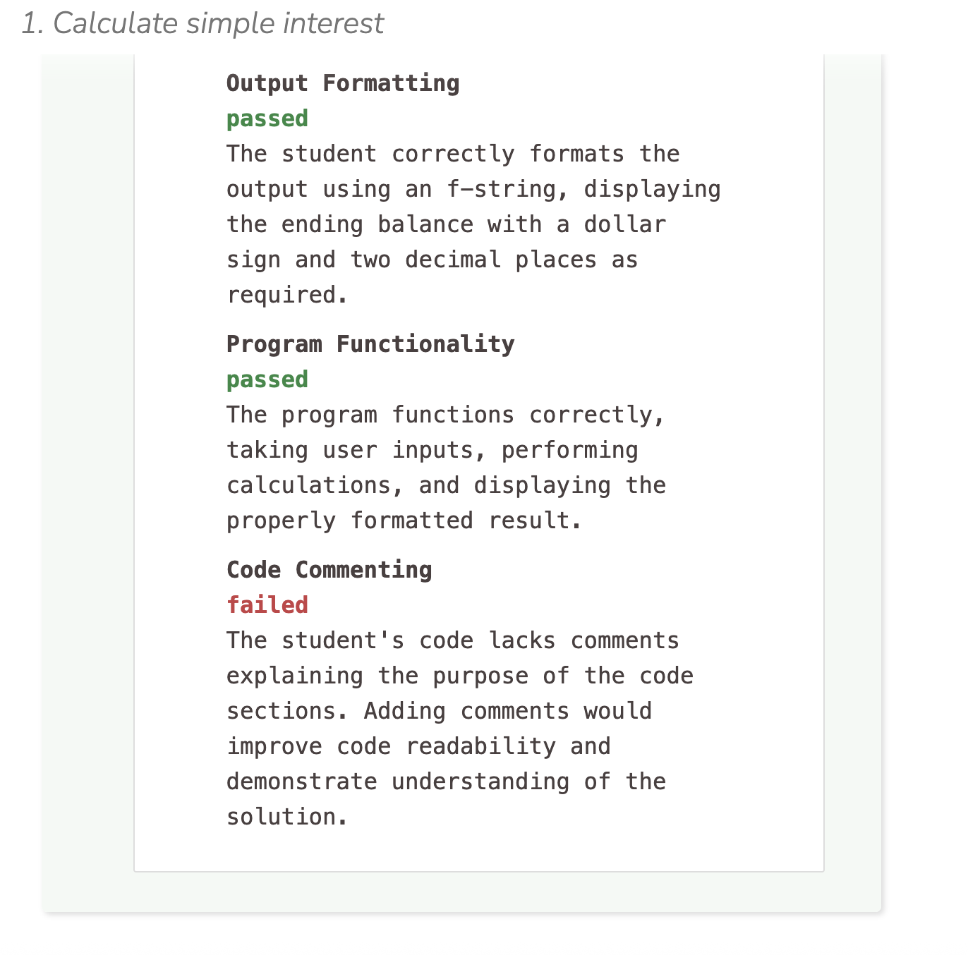 The grading occurs when the student clicks the Check It button. The LLM Grading agent uses the following to grade the student’s work: